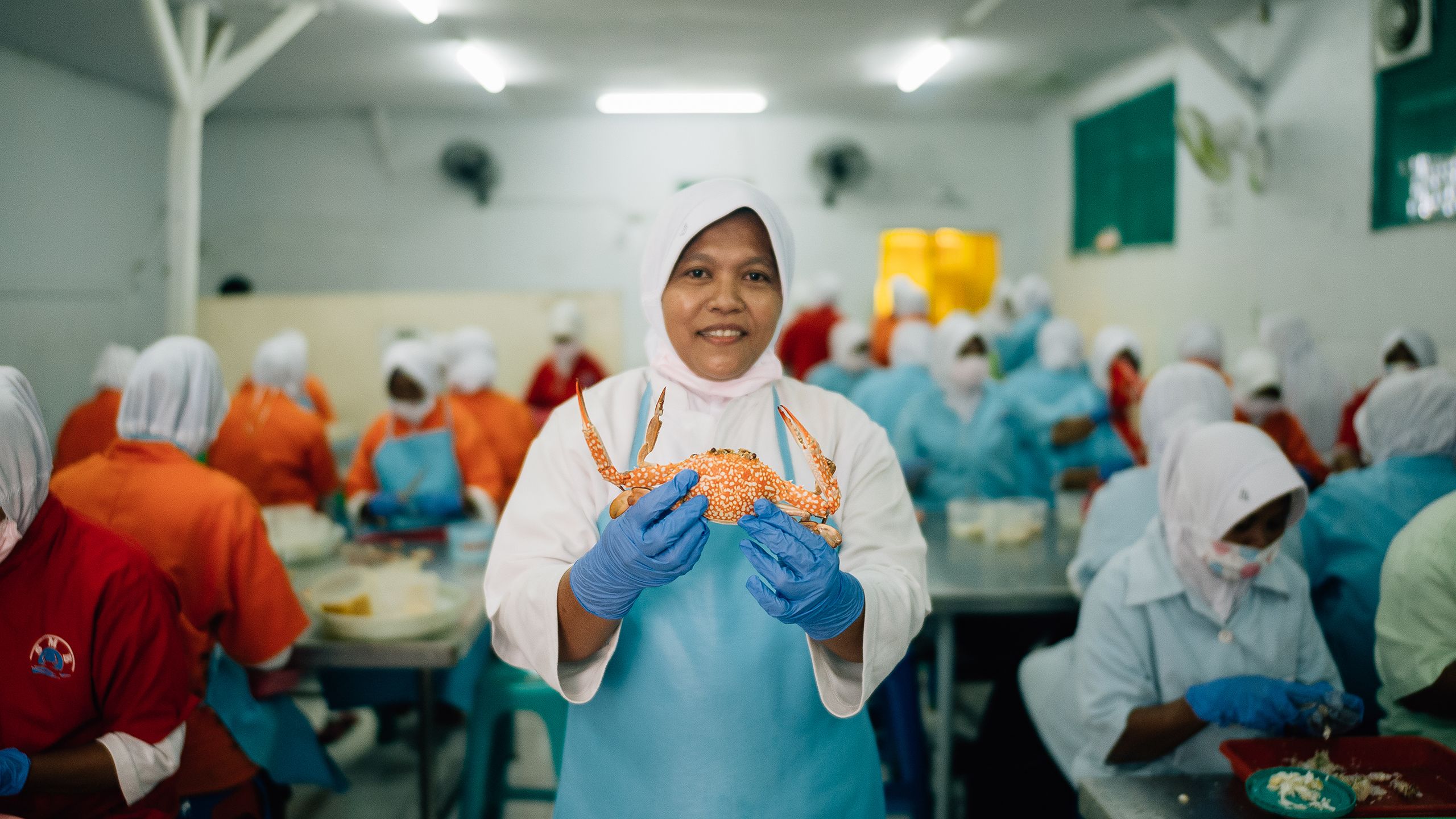 Siti is onderdeel van het hele leger van vrouwelijke medewerkers die handmatig het vlees van de krab plukken.